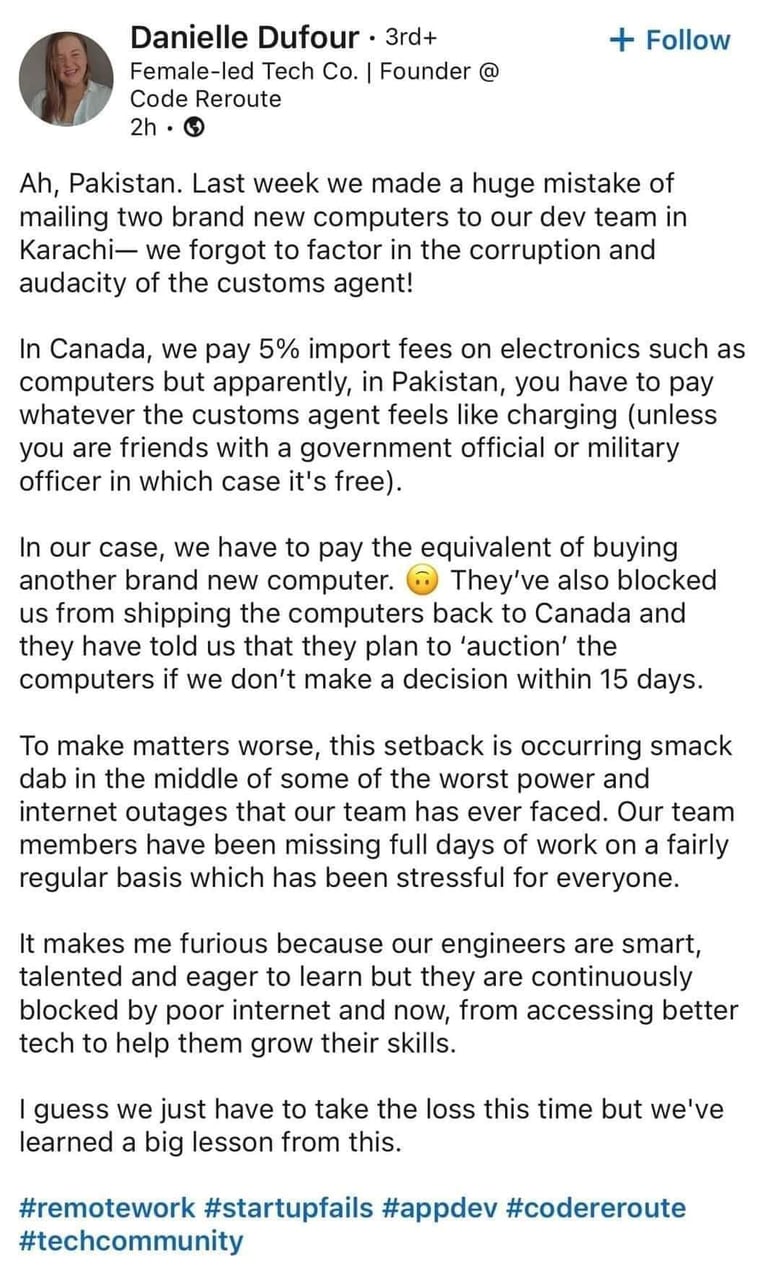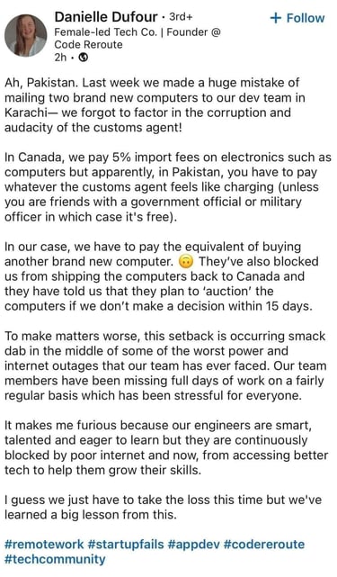 the founder of the female-led tech company, Code Reroute. Dufour's company, based in Canada, attempted to ship two brand-new computers to their development team in Karachi. However, they were met with unexpected and exorbitant demands from Pakistani customs officials.
